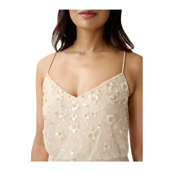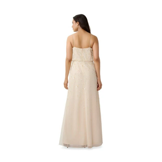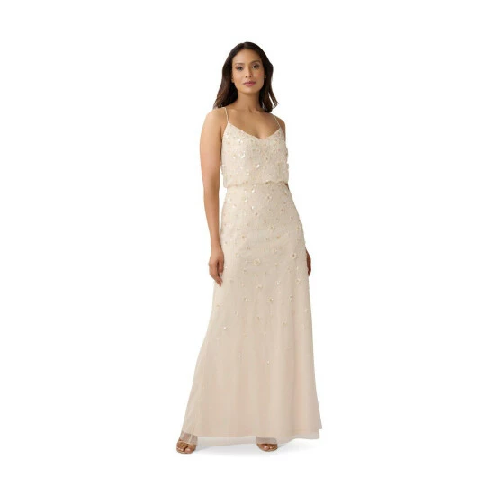 Sparkle and shine in our iconic blouson gown artfully embellished with handsewn 3D floral beading. The delicate spaghetti straps, v neckline and easy-fitting silhouette add to the feminine feel. Sleek back zip closure. A beautiful choice for bridesmaids, mother-of-the-bride/groom, wedding guests, charity balls and black-tie galas.