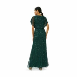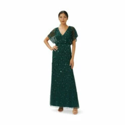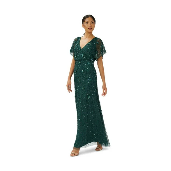 The dress you need when you want maximum glamour and glitz. Intricate handsewn 3D floral beadwork blooms allover our floor-sweeping gown designed in our iconic (and figure-flattering) blouson silhouette. We especially love the sheer illusion flutter sleeves and clean surplice neckline. The long skirt is finished with gentle pleats for added movement and sway on the dance floor. Sleek back zip closure.