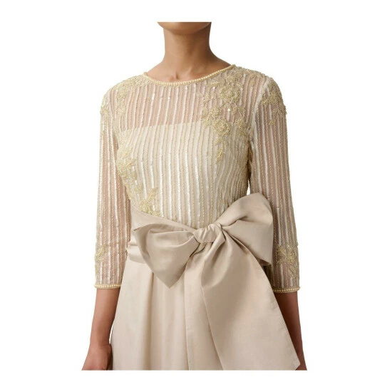 Make your grand entrance in our eye-catching ball gown that combines artfully placed handsewn beadwork on mesh and a full skirt in a luminous taffeta. We love the oversize self-tie bow belt that transforms this classic design. Details: sheer illusion yoke and three-quarter sleeves. Sleek back zip closure.