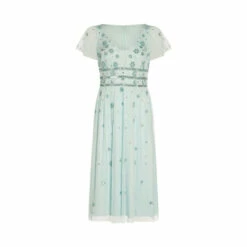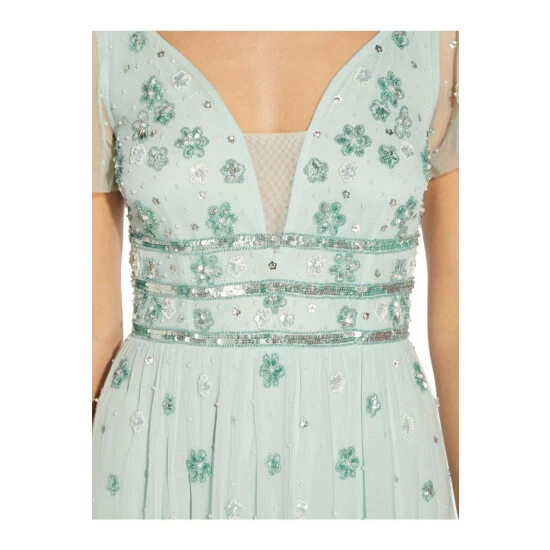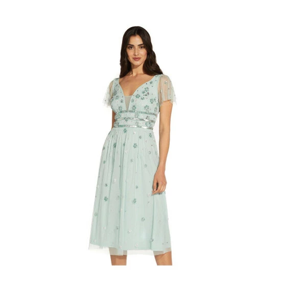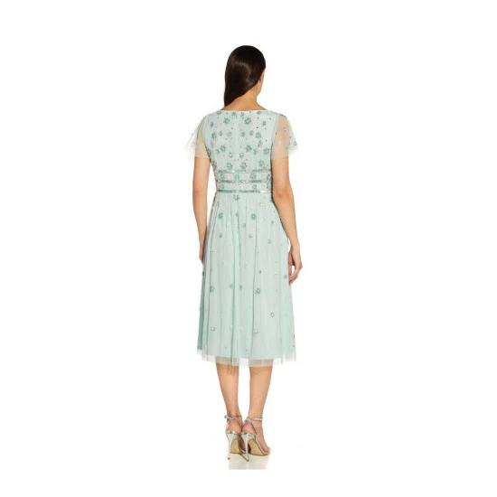 Elevate your party style with our chic and feminine midi cocktail that is beautifully accented with sparkling hand beadwork in a delicate floral pattern. We’re obsessed with plunging sweetheart neckline with a mesh panel for added coverage and the sheer illusion short flutter sleeves. This dress is shaped with a gently fitted bodice with banded waist and pleated skirt that will move beautifully with every step.
