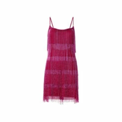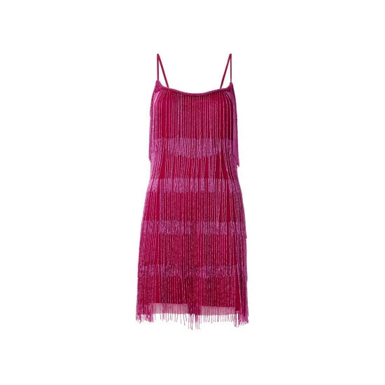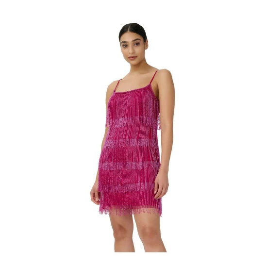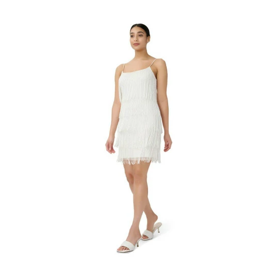 Twirl the night away at your next party in this showstopping shift dress, dripping with sparkling (and dramatic) rows of hand-beaded fringed trim. This statement-making style is designed with delicate spaghetti straps, a flattering no waist seam and a sleek back zip closure. A perfect choice for cocktail parties, rehearsal dinners, holiday soirees and wedding celebrations. Full knit lining for comfort.