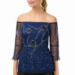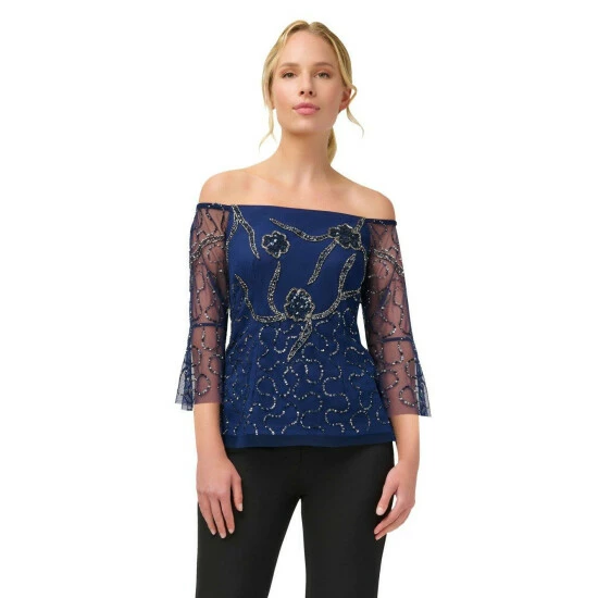Sparkling and simply amazing for so many events, this exquisite off-the-shoulder top dazzles with allover handsewn beadwork. All the chic details: sheer illusion three-quarter sleeves with dramatic bell cuffs and sleek back zip closure. Pair it with jeans for a girls night out or dinner date or with a wide-leg pant for a pencil skirt to elevate your look for cocktail parties and wedding celebrations.