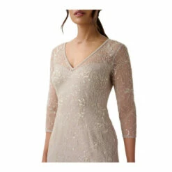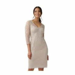 Opt for our timeless cocktail dress that is dripping with eye-catching hand beadwork for your next event. We love the delicate sheer illusion v-neckline, three-quarter length flared sleeves, and no waist seam design that creates a smooth, flattering silhouette. Every wardrobe needs a dress that sparkles and this sheath style is a chic choice to wear in every season.