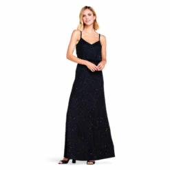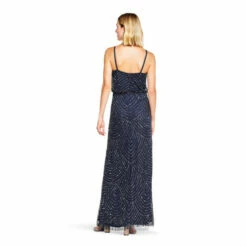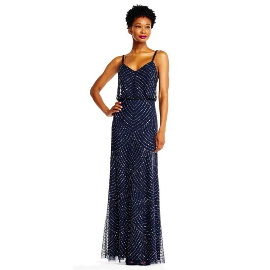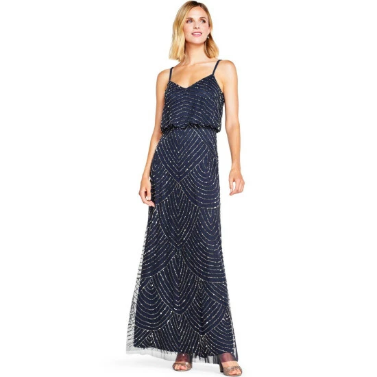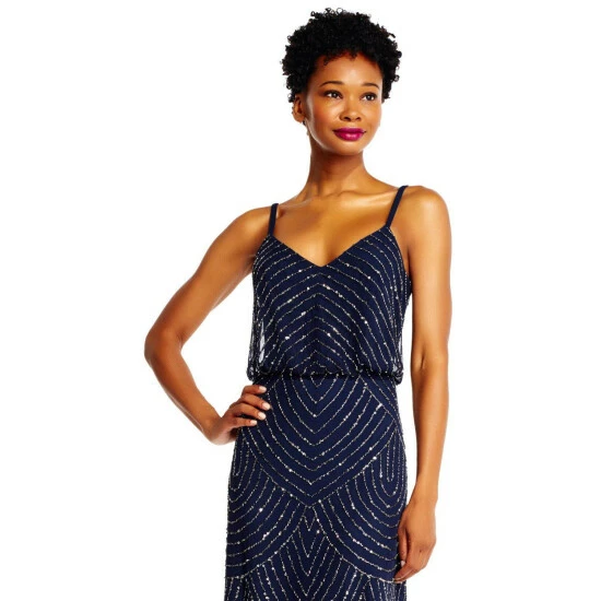 A scalloped, art deco pattern filled with sparkling sequins and beading adorns this evening gown, which also features a flattering v-neckline, back-zipper closure and a blouson bodice. Add a pair of sparkling earrings to this beautiful beaded dress to seal the deal on a stellar special occasion look. A stunning option for everything from a beach wedding, to prom or special events.