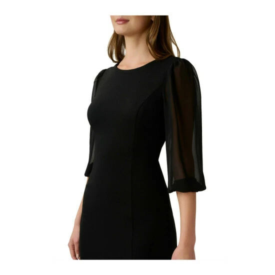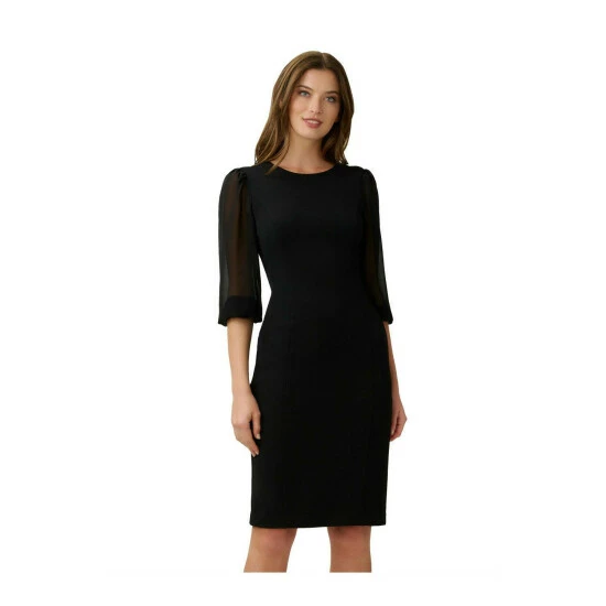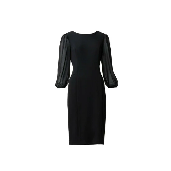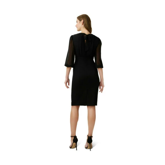 Striking both coming and going, our sheath dress is crafted of a luxe stretch knit crepe and elevated with sheer chiffon three-quarter sleeves with elastic cuffs and shirred chiffon back with keyhole opening and tie closure. The perfect dress for all your events on your calendar. Princess seaming for a tailored shape. Sleek back hook-and-eye/zip closure. Fully lined.