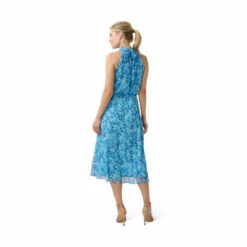 Lightweight and flowy, this leaf printed crinkled chiffon pull-on dress is full of feminine charm from the shoulder-baring halter neckline with pleated mock collar and back tie to the flirty back keyhole opening. We love the flattering (and comfortable) blouson bodice and back elastic waist. All the details: delicate shirring along the bodice for added texture. The midi skirt is cut on the bias for a beautiful drape.