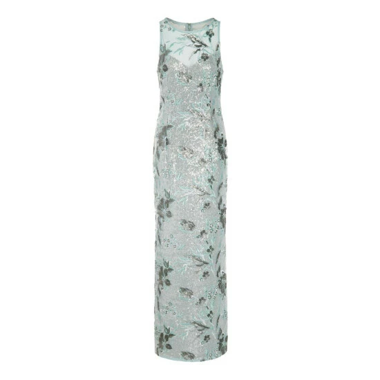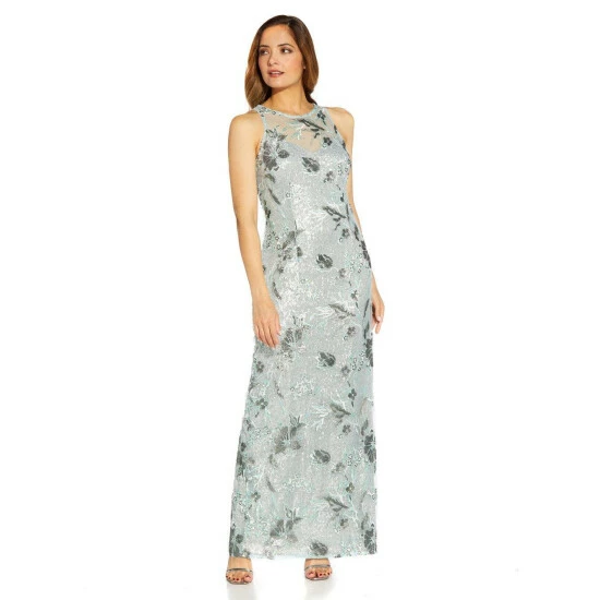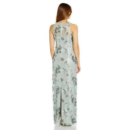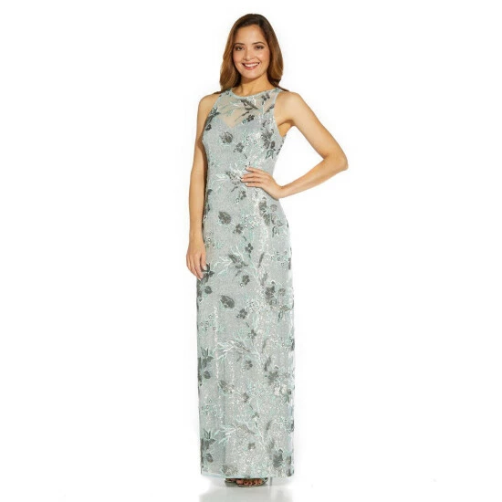 This elegant dress from Adrianna Papell boasts a beautifully sleek design suited to wide variety of occasions. Featuring a flattering mesh halter neckline and a sleeveless embroidered bodice and skirt on a slim column silhouette, this is the perfect main piece to wear when attending the best events of the season: a ball, red carpet, or black-tie event.