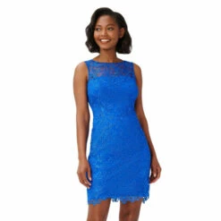 Our iconic and elegant sleeveless sheath dress is designed with a delicate Guipure lace overlay in a stunning floral pattern. Love the sheer illusion yoke. (so feminine). Sleek back zip closure. A stunning look for brunch, cocktail hours and bridal showers.
