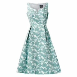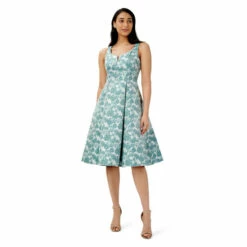 A stunning look to wear to all your special occasions. Our timeless and iconic fit-and-flare dress is made from a striking woven jacquard fabric in a striking floral design. Dramatic box pleats at the waist shapes this dress. Details: a flatting scoop neckline with notched detail. Perfect to wear here, there and everywhere.