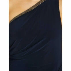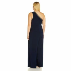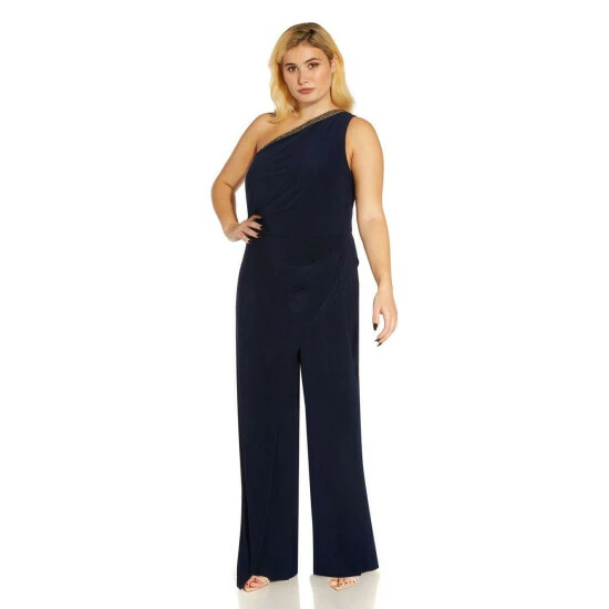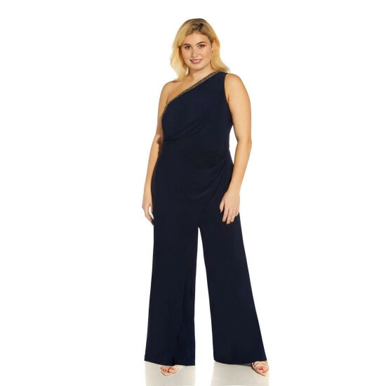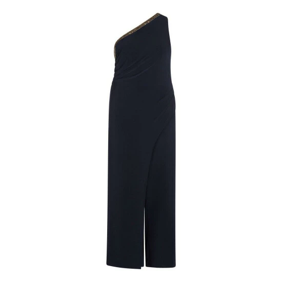 That perfect evening jumpsuit that blends classic elegance with a side of fun. Our stretch matte jersey jumpsuit is ready to party with its one-shoulder silhouette that is accented with sparkling beadwork. The wide-leg pants are finished with a lightweight shirred overlay. Side zip closure.