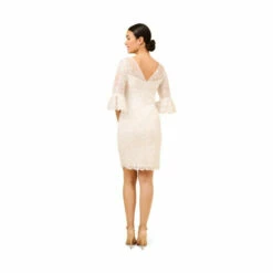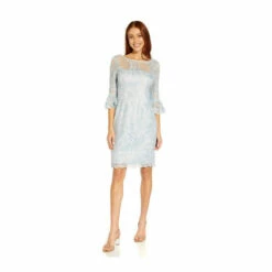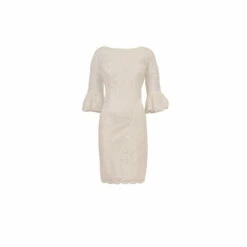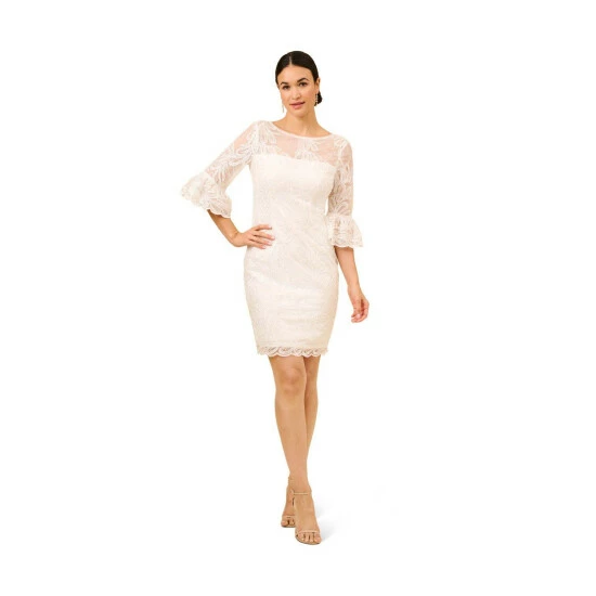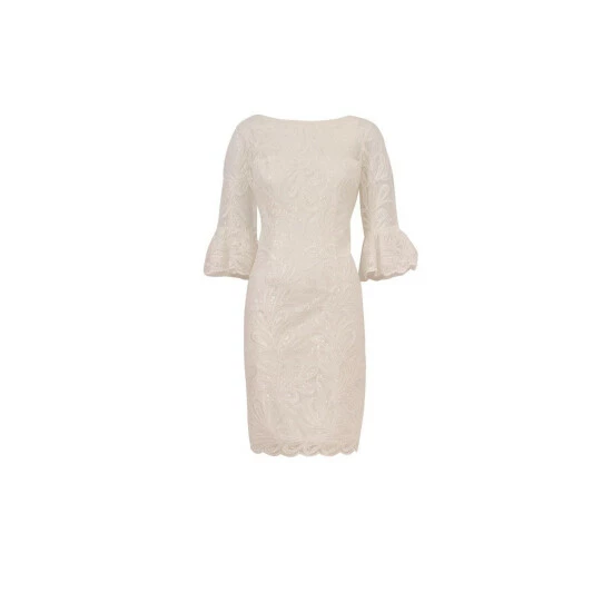 Top style honors will go to you on any occasion. Our gently fitted sheath dress gets elevated with stunning ribbon embroidery in a swirly paisley pattern. All the feminine details: the sheer illusion yoke and elbow sleeves with bell cuffs, scalloped edges, bateau neckline and seamed waist. A stunning choice for mothers-of-the-bride/groom and wedding guests.AP1D104723