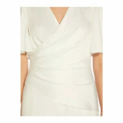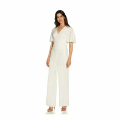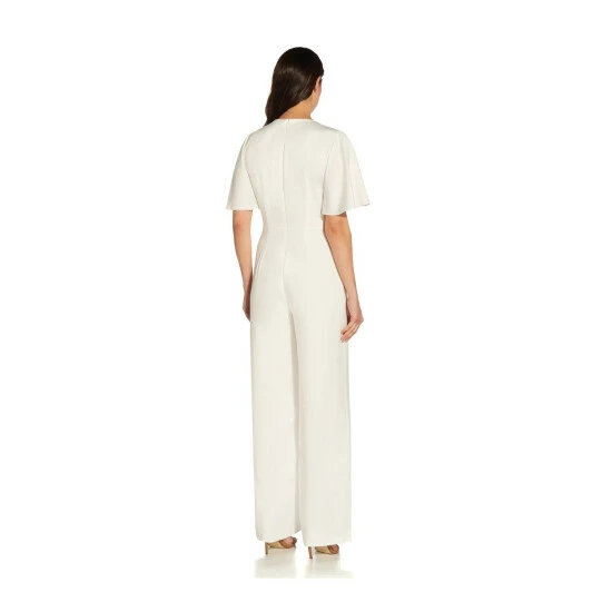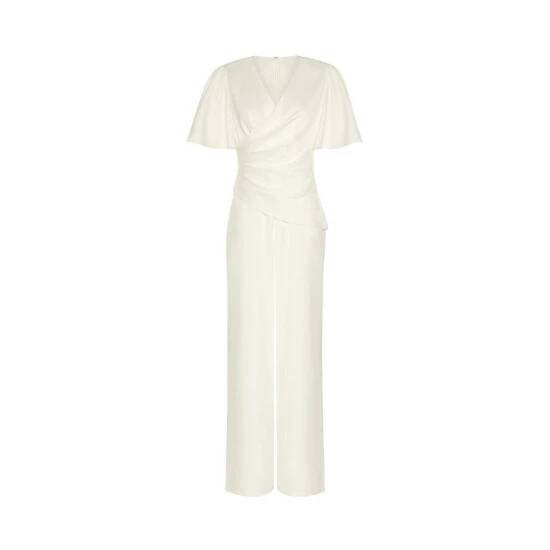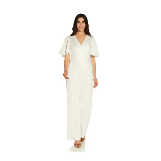 A modern jumpsuit with a serious wow factor. This season favorite look the jumpsuit, crafted in a lightweight satin crepe and designed with a flattering surplice neckline and a wide-leg silhouette. Obsessed with the short flutter sleeves and the soft ruching for added dimension. Back hook-and-eye zip closure. Love for every minute of wedding season, bridal showers to rehearsal dinner and a perfect choice for a wedding reception.