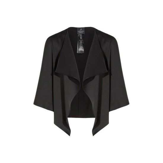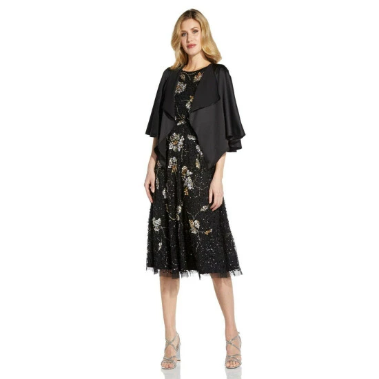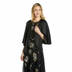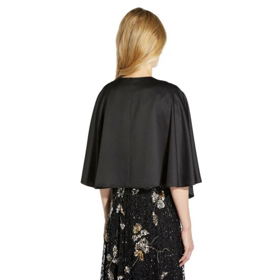 This elegant cape from Adrianna Papell is cut from a beautiful satin fabric, which makes it the perfect cover up for any outfit. Whether layered over a formal evening dress or a chic pair of trousers and a blouse, the sleeves fall in a beautiful drape fashion over the arms, and had a draped, waterfall neckline. The perfect finish for those chilly spring time evenings, whether it be at a dinner or a wedding.