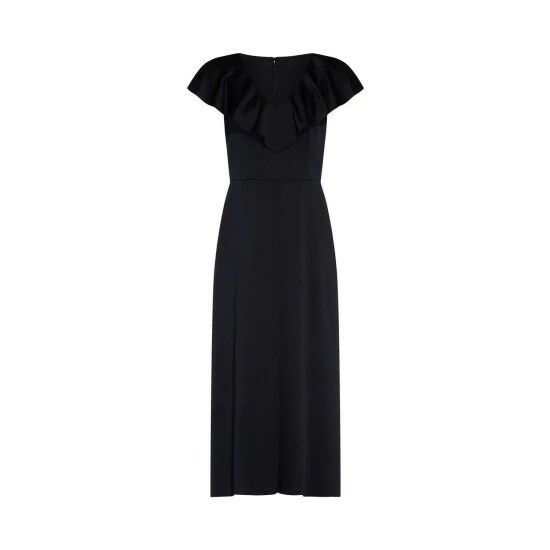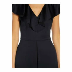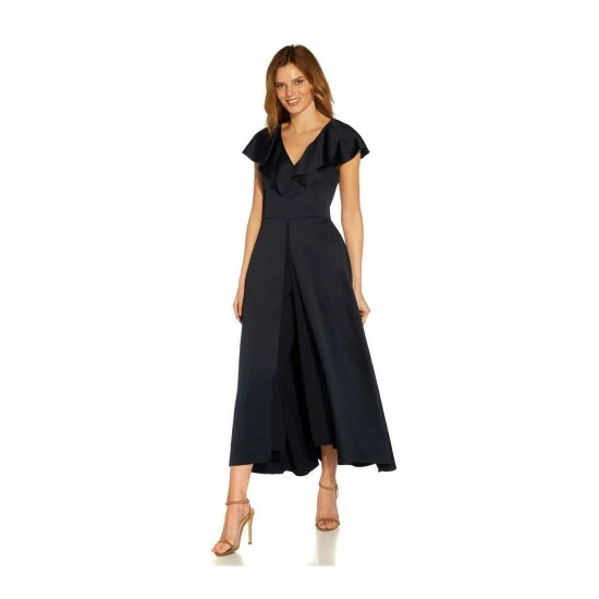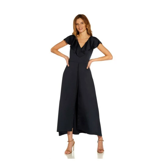 The standout style of the season in a cropped design. Our playful and dramatic jumpsuit crafted in a woven satin crepe is finished with a dramatic ruffle along the v-neckline. The wide-leg silhouette is designed with a floaty skirt overlay. An easy add-to-cart for dinner dates, baby or bridal showers and wedding parties.