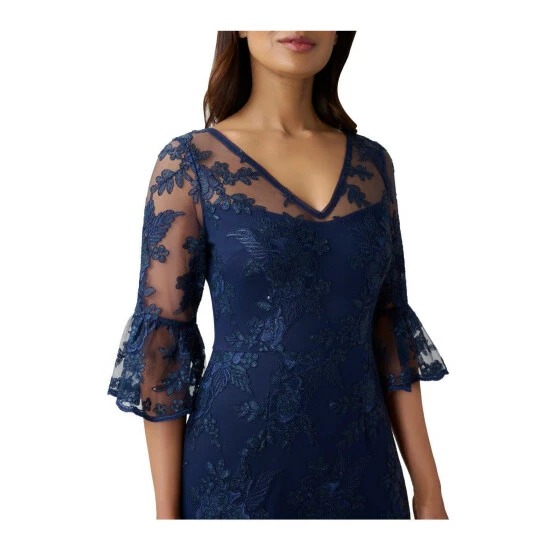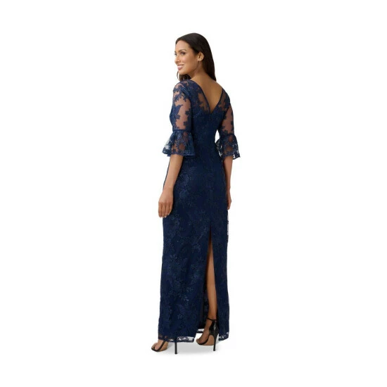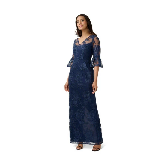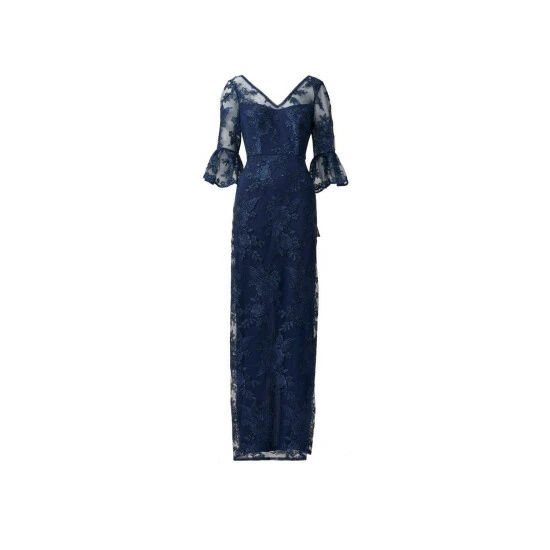 Feminine and timeless, our long column gown is fashioned from corded embroidery in a floral pattern and sprinkled with handsewn glittered sequins. All the details: sheer illusion yoke and elbow sleeves with scalloped bell cuffs and a clean v-neck and back. Sleek back hook-and-eye/zip closure. An elegant choice for mothers-of-the-bride/groom and black-tie gala attendees.