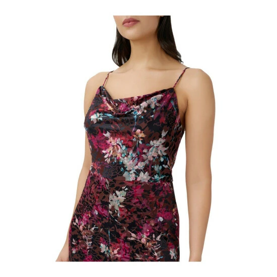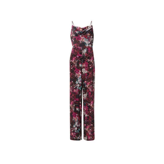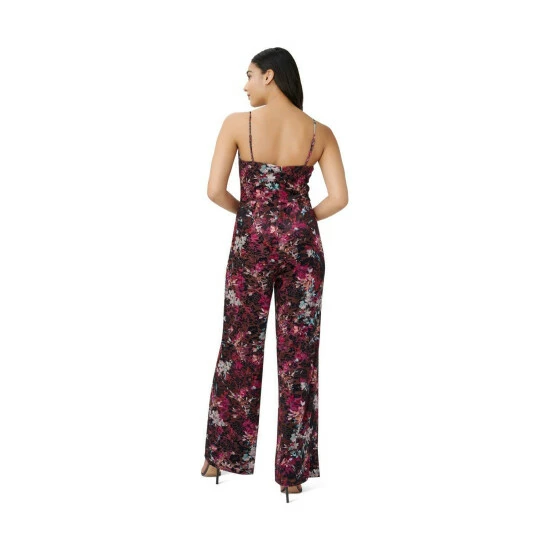 An instant mood booster. Our iconic jumpsuit, designed in a buttery soft stretch velvet features a burnout floral print. All the chic details: delicate spaghetti straps, cowl neckline and wide-leg pants. Sleek back zip closure.