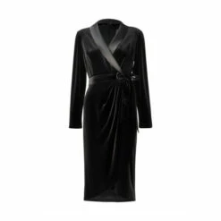 A classic menswear-inspired tuxedo midi dress in a soft stretchy velvet fabric that easily takes you from the office to a night out. Details we love: the flattering surplice neckline, satin shawl collar, long sleeves with modified shoulder pads and a draped faux wrap skirt. The look is finished with a figure-flattering tie waist. Back hook-and-eye/zip closure. A go-to look for cocktail parties, dinners dates, fundraising galas and wedding receptions.