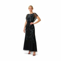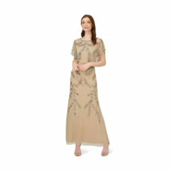 When your night calls for a dose of glitz and glam, our floor-sweeping gown will dazzle at all your special events. Designed in our iconic (and flattering) blouson silhouette, this year-round favorite features artfully placed handsewn beadwork in a striking leaf pattern and sheer illusion flutter sleeves with a scalloped edge.