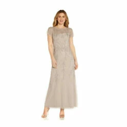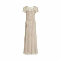 Refined and striking, our floor-sweeping gown gets elevated with exquisite hand beadwork. Designed with sheer illusion neckline and short flutter sleeves. A figure-flattering seamed waist tops a soft, flowy skirt with gently pleats for added sway and movement. An easy add-to-cart for all your formal occasions and wedding celebrations.